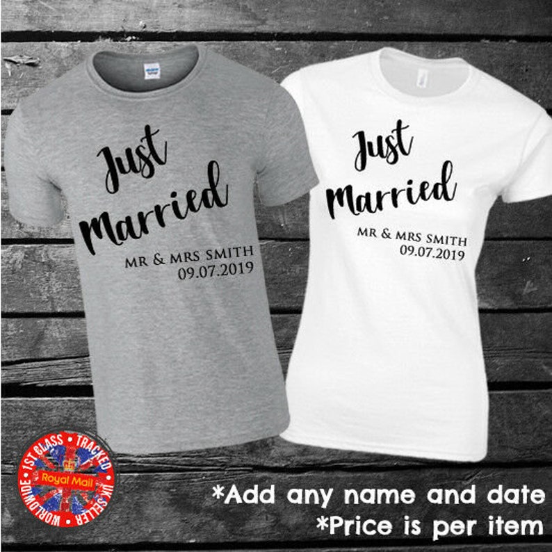 Just Married T-shirt SALE: $17.90 Just Married T-shirt has bold, bright colors Matching Couples T-Shirt for Husband and Wife Just Married Shirts Wedding Honeymoon Shirts Casual Short Sleeve Tops Just Married T-Shirt, Just Married Hoodie, Custom Honeymoon Shirt, Mr and Mrs Honeymoon Gift, Honeymoon T-shirts, Newlywed Tshirt (6.9k) Sale Price $9.99 $ 9.99 $ 14.27 Original Price $14.27 (30% off) Add to Favorites Wedding Day Shirt Trendy Motorcycle Biker Just Married T-shirt Mr Mrs Husband Wife Wedding Reception Tops Couples Matching.